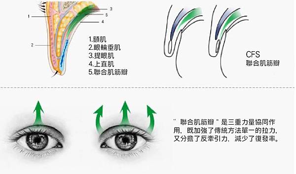 「提上眼瞼肌」負責眼皮的上提功能,「上直肌」負責眼球的往上轉。他們兩者的運動方向是平行一致,而他們中間共用的筋膜,就是「聯合筋膜鞘」(CFS,Conjoint Fascial Sheath)。利用聯合筋膜鞘同時具有兩種連結往上的力量,綜合上直肌與提上眼瞼肌的力量,帶動上眼瞼運動,能同時保障眼瞼與眼球的服貼度與位置。從聯合筋膜鞘著手,這是目前治療眼瞼下垂的一個新趨勢。
