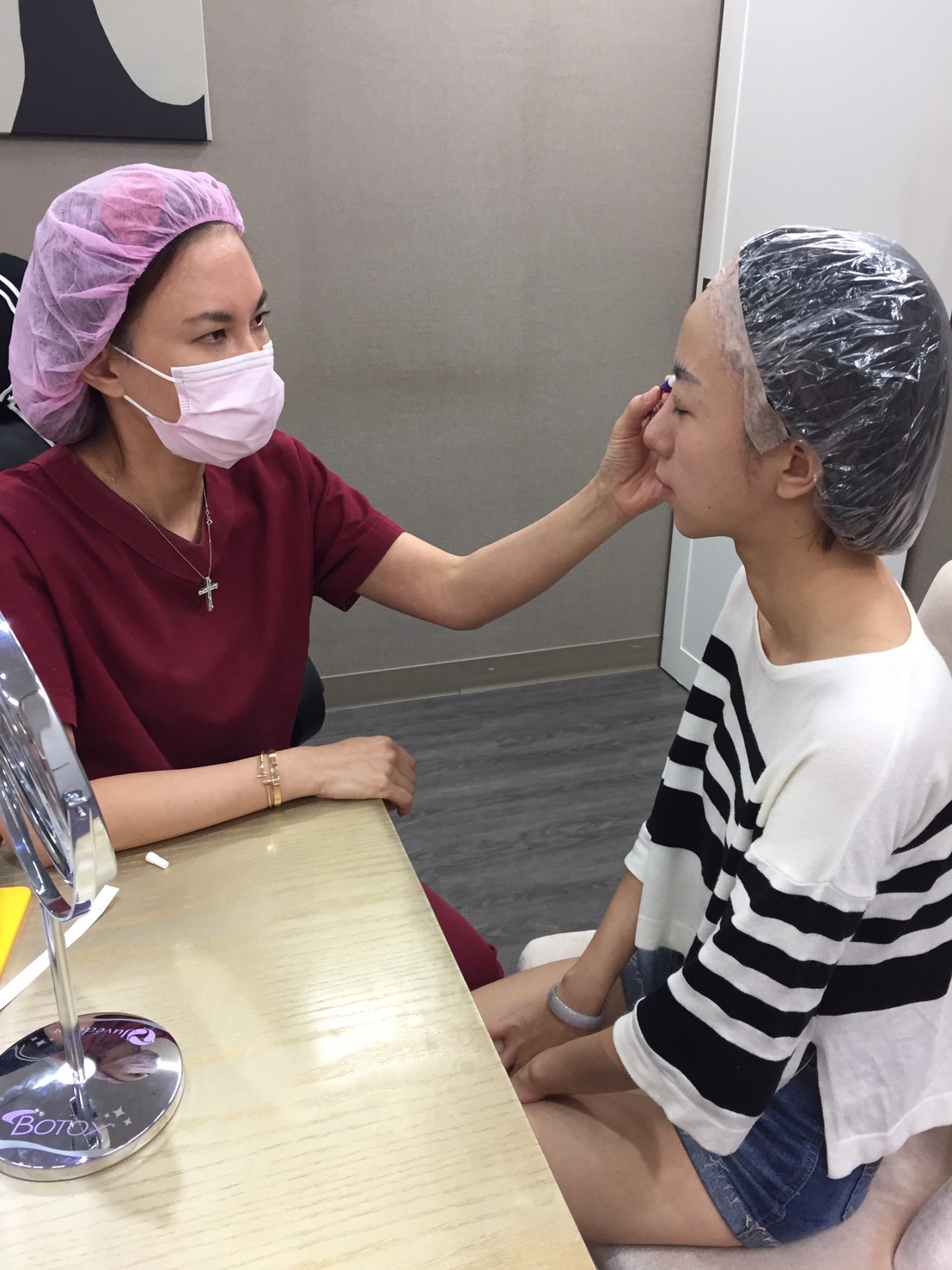 三:依照新設計的摺線固定,並請病患張開眼睛或坐起來評估褶線的平順度與自然度。