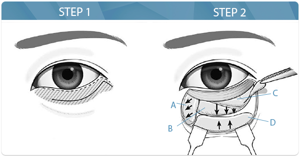所謂眼袋複合式手術: 是利用睫毛下方的皮膚傷口,處理脂肪膨出,修剪多餘皮膚 ,並提升中臉下垂的組織 (SOOF), 這樣複合式的處理, 可以讓下眼部的曲線更加平順緊緻!