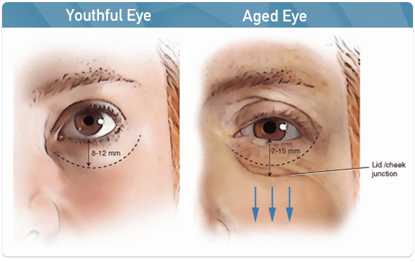 因為隨著年紀,眼皮和臉頰的交界面(Lid Cheek Junction)也會慢慢下降,而不是呈現上提、緊緻的情況。所以就算處理完脂肪、皮膚,下眼部還是呈現三角形垂墜的假性眼袋。