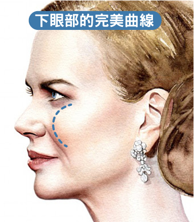 而所謂下眼部的完美曲線: 指從眼部睫毛下是飽滿的臥蠶, 臥蠶下一點凹陷後,連接是緊實的中臉頰, 沒有眼袋或頰溝的問題。